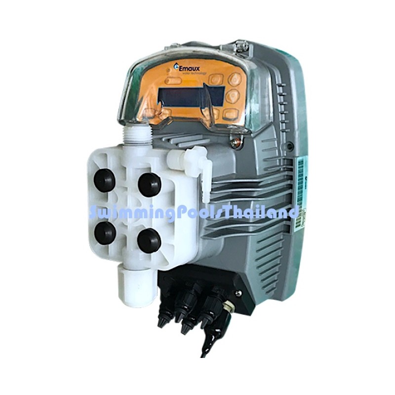 Unlike traditional peristaltic pumps, the chlorine dosing pump is activated by a PTFE membrane mounted on a piston and electromagnet. When the piston on the electromagnet is attracted, a pressure is produced in the pump body with an expulsion of liquid from discharge valve. Once the electric impulse is finished a spring bring the piston back to the initial position, with a recall of liquid through the suction valve. LED indicators control panel to monitor the dosing pump, with electronic micro‐control technology. Easy operation without lubrication requested, is almost maintenance free.electromagnetic membrane.