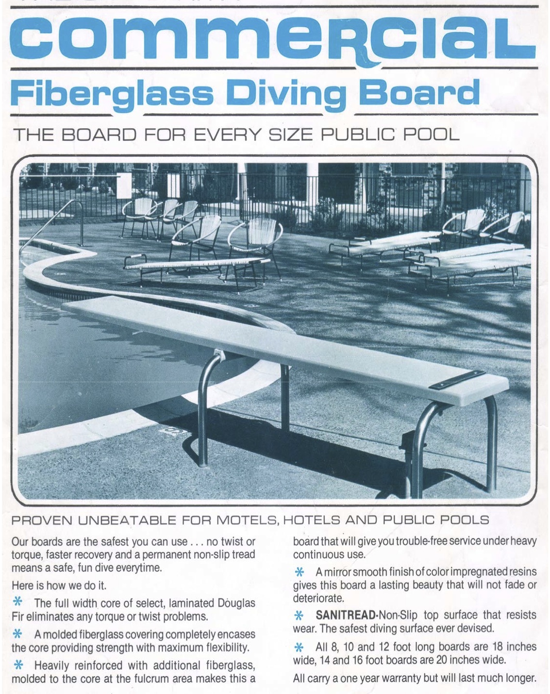Diving board 10' (3.00m) long complete with tubular stainless steel stand. White with blue safety edge.