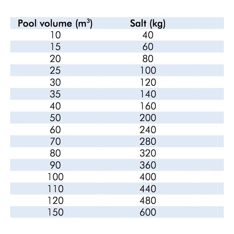 How much salt does a pool need? Normally between 3kg and 5kg (depending on brannd and model) of salt for every 1,000 litres (m3) (220 gallons) of swimming pool volume is required to reach 3,000 to 4,000 ppm. So you would need about 9 x 25 Kg bags to start a typical 10 x 4 pool. Different chlorinators require slightly different levels of salinity so do follow the manufacturers' recommendation for best results.